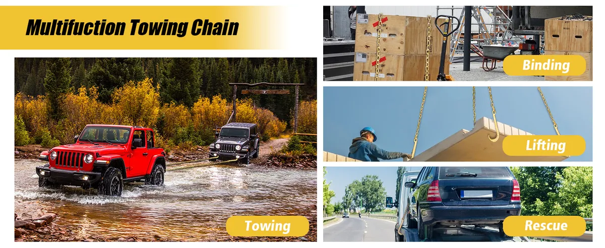 | Product Name | G70 Towing Transport Truck Trailer Chain with single 15″ J Hook and R/T/J/Eye Grab Hooks |